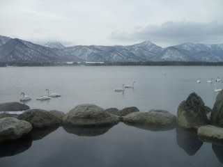 しかし、目の前が屈斜路湖という絶好のロケーションが、欠点を補ってあまりある開放感や爽快感を与えてくれ、大空の下で大自然に溶け込んだかのような雄大な気分を味わえます。何しろ浴槽の縁の向こう側は屈斜路湖の湖水であり、お湯に浸かっているとあたかも自分と湖が渾然一体となっているかのような気分になります。特に冬に訪れると、沢山の白鳥が湖面で羽根を休めており、白鳥を至近距離で戯れるかのように眺めながら、のんびりと湯浴みすることができます。