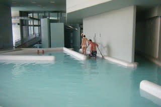 バスの運転手に先ほどのハードコピーを見せて目的地を知らせて乗車し、エゲルから約15分で温泉前へ到着。辺りには畑と林以外何もありません。バス停近くには広い駐車場があり結構な台数の車がとまっています。そしてその奥にリゾート施設らしき建物がちらちらと窺えます。その建物の方向へ歩くこと約5分、視界の右手には真っ白な石灰棚が見え、そして正面には鮮やかな青いプール群を前にして”Salt Hill Rogner Thermal Spa”聳え建っていました。建物の下層階はリゾート施設として使われ、上層階はホテルの客室のような構造になっているのですが、その上層階はまだ工事中で(あるいは工事途中でストップされたまま)、一般客は立ち入れないようになっていました。