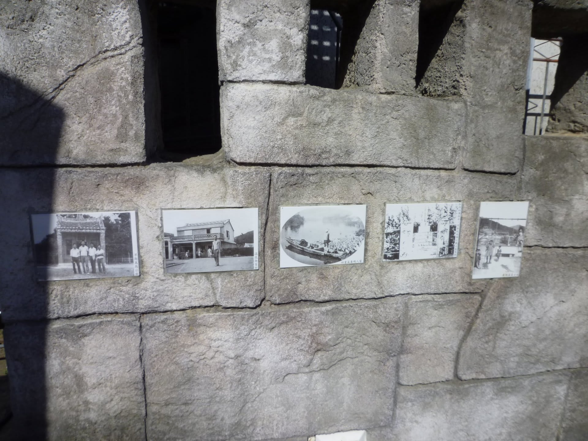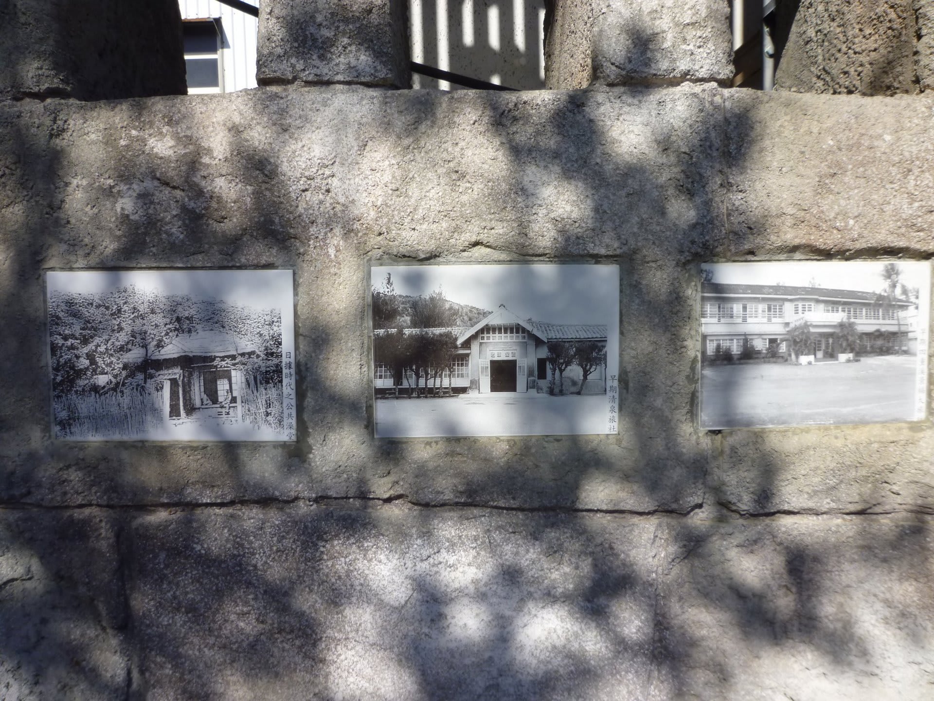 四重渓温泉のメインストリートから南台湾温泉飯店や玉泉寺へ上がる路地が分かれる交差点に、小さな公園があります。温泉マークを模したモニュメントと共に「四重渓温泉」と記された化粧壁が立っているのですが、そこをよく観察する、と壁に埋め込まれたタイルには写真がプリントされており、それらは日本統治時代の当地の様子を撮影したものでした。
