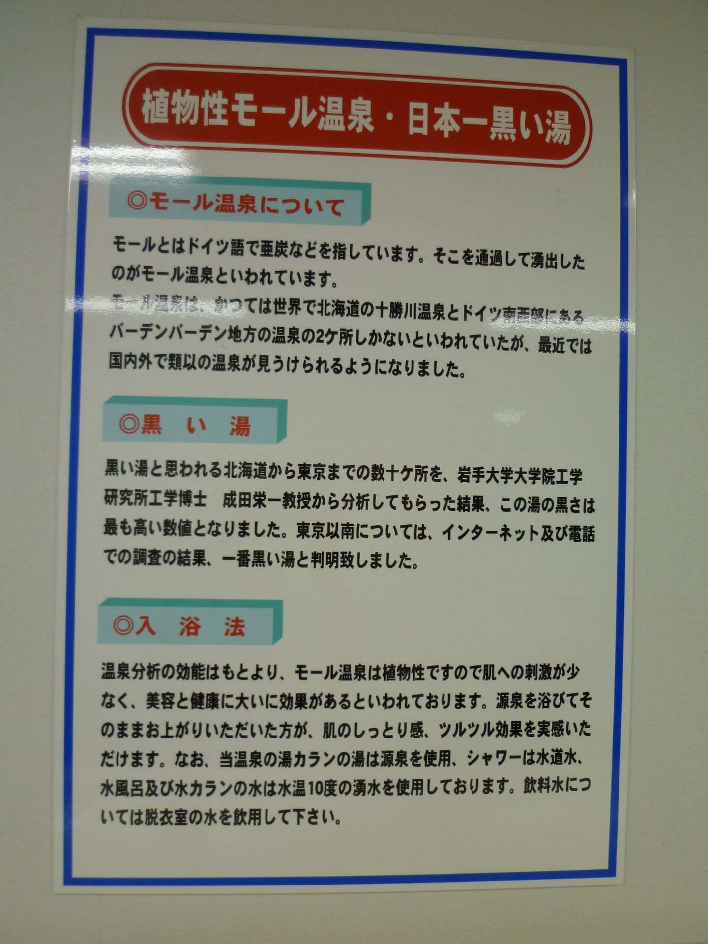館内の説明には「黒い湯と思われる北海道から東京までの数十ケ所を(上述の教授氏に)分析してもらった結果、この湯の黒さは最も高い数値となりました。東京以南については、インターネット及び電話での調査の結果、一番黒い湯と判明致しました」と書かれています。先生、本当ですかぁ? ちょっと首を傾げたくなりますが、まぁ確かに東北地方でこの黒さは珍しいかもしれません。またこの説明掲示ではモール泉を謳っており、確かに褐色でつるすべ感の強い特徴はモール泉ならではですが、いわゆるフミン由来のモール臭はあまり感じられず、つるすべ浴感も他のモール泉に比べたらそんなに強いわけでもないような気がしました(蛇足ですが、私の自宅の近所にある「湯快爽快・くりひら」の方が循環しているくせに余程ヌルヌルスベスベします)。本格的なモール泉である北海道の十勝川温泉や、黒湯の本場である東京の城南地区・横浜・川崎の温泉を知っちゃうと、ちょっと物足りなさを感じてしまいますが、東北地方においては確かに個性的な存在感を放っているように思います。モール泉という点に拘るから余計なことを言いたくなっちゃいますが、お湯そのものは良好ですし、浴槽もいろいろあって使い勝手が良いので、浴場としては十分評価できると思います。いつも混んでいるのが、その証拠。