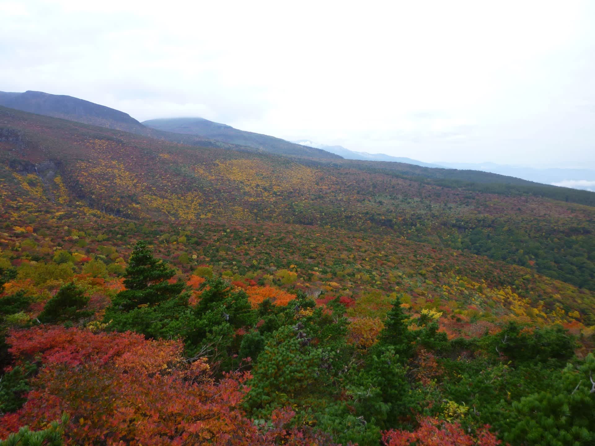 途中矢筈森分岐(牛の背)までは来た道を戻ります。馬の背からは、これから下るくろがね小屋方面の湯川の谷が一望できました。こちらも紅葉が綺麗だわ。