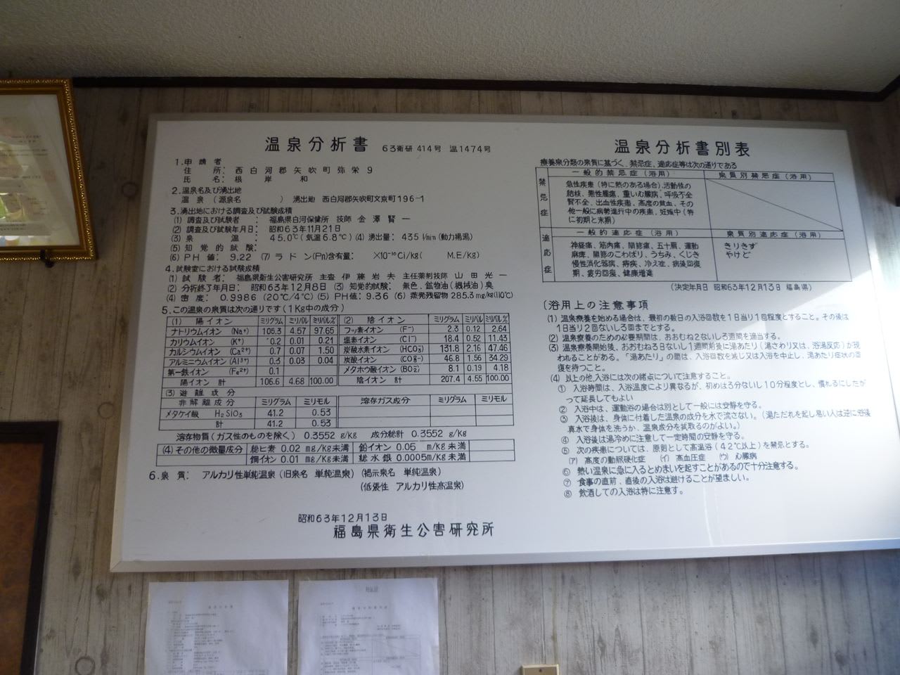湯屋へ入ったところには温泉分析表が2つ掲示されており、片方は昭和63年、他方は平成16年のものでした。両者の間で成分的な変化は少なく、安定した泉質が維持されているようですが、気になるのは湧出量でして、昭和63年は毎分435Lあったものが、平成16年では毎分227Lと半減しています。こちらではボーリングした源泉井からポンプアップしているのですが、湧出量自体が減っているのか、あるいは意図的に汲み上げる量を減らしているのか、その辺りは定かではありません。