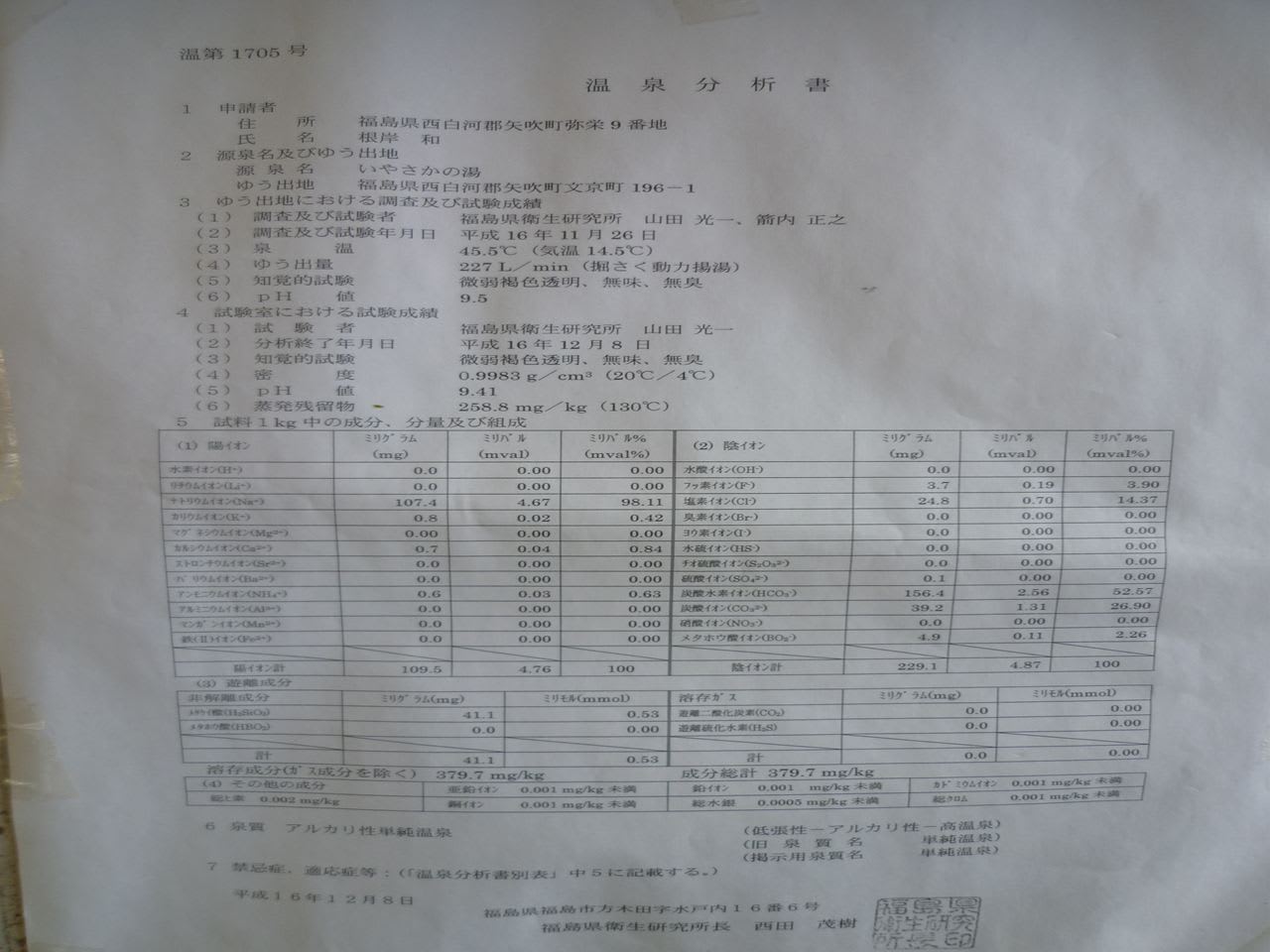 アルカリ性単純温泉 45.5℃ pH9.5 227L/min(掘削・動力揚湯) 溶存物質379.7mg/kg 成分総計379.7mg/kg