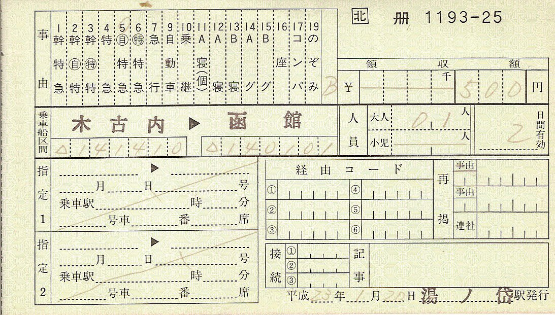 これがその湯ノ岱駅で発行された料金補充券による「木古内→函館の自由席特急券」です。手書きの切符って味があっていいですね。事務管コードもちゃんと記入されています。駅員さんも実に手慣れた様子でさらさらと記入していました。