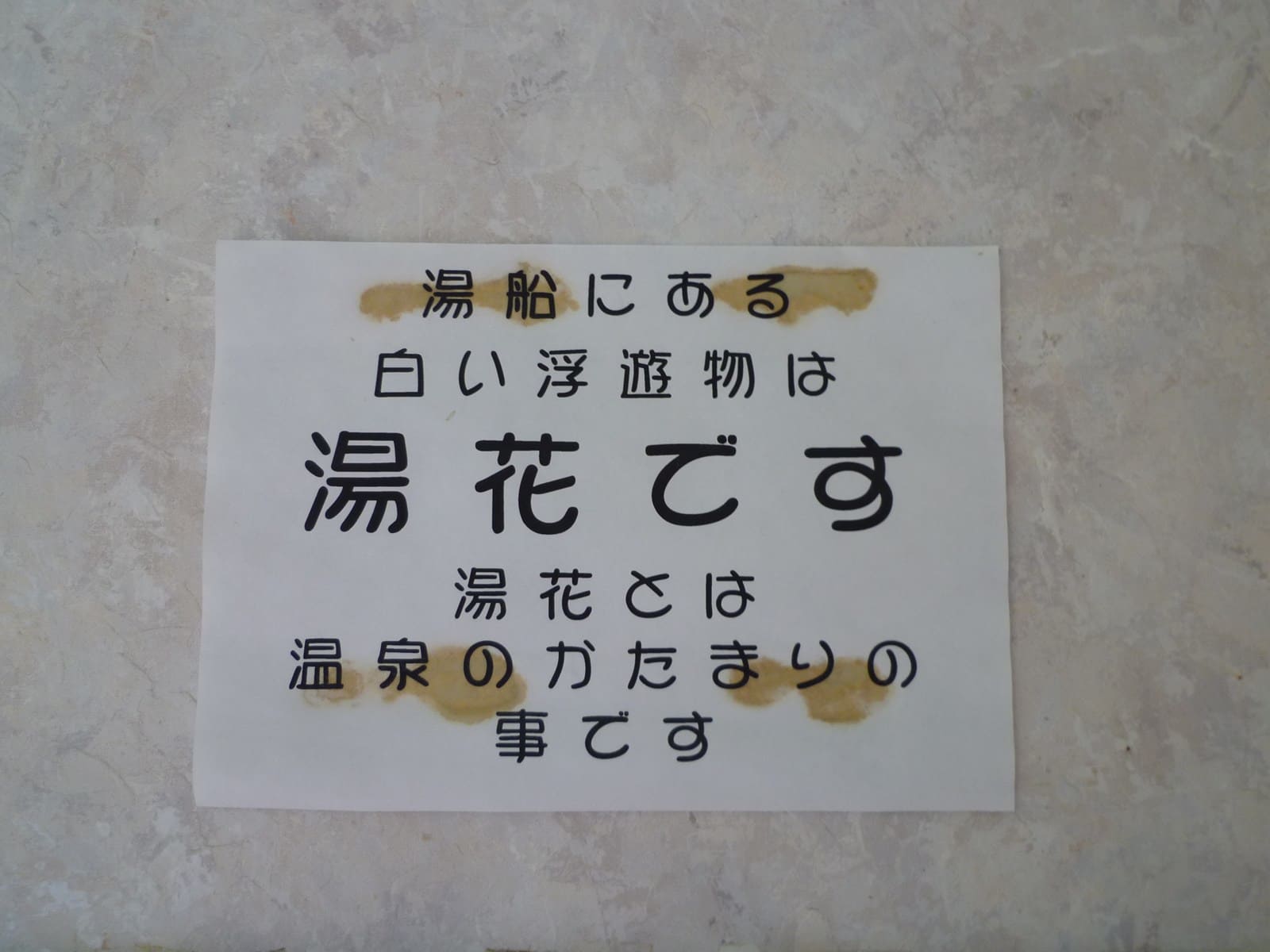 湯口のまわりには硫酸塩の白い析出がこびりついていました。写っていませんが、湯口傍にはコップが置かれています。