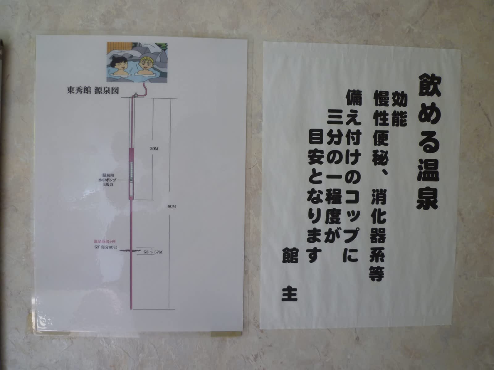 また源泉がどのように汲み上げられているかを図示して説明されている点も、とっても好感持てます。この図に拠れば地下80mほど掘削して5馬力のポンプで揚湯しているようですね。