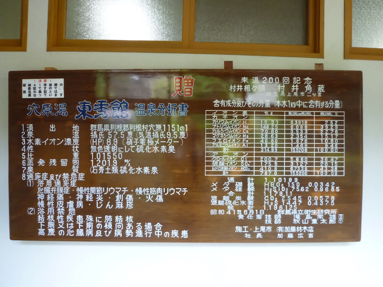 浴室手前の廊下には木板に書かれた昭和41年の分析表が掲示されていました。今はアルカリ性単純泉ですが、昔は石膏土類硫化水素泉に分類されていたんですね。今と比べると成分が全体的に濃かったようです。