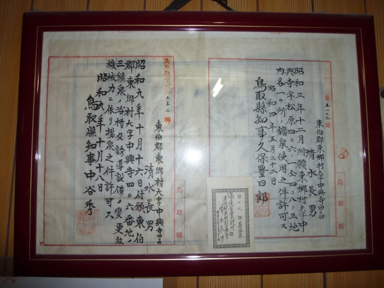 右は昭和4年に出された鉱泉の使用許可書、左は昭和9年の温泉ポンプアップ許可書、その間に小さな湯屋営業許可証(年代不明・ここに書かれている日付は申請者の生年月日)です。額縁に入れられて脱衣所内に掲示されていました。そんな昔からこの湯屋は営業しているんですね。そして昔から代々清水さんが運営なさっているようです。