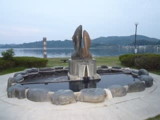国民宿舎水明荘の隣、東郷湖の南湖畔にある公園です。この公園のまさに湖岸に、鯉が滝登りをしていそうな格好の像が建っており、その周りが足湯になっています。なお東郷湖の温泉は鯉が見つけ出したという言い伝えがあるために、鯉が像になっているんでしょう。