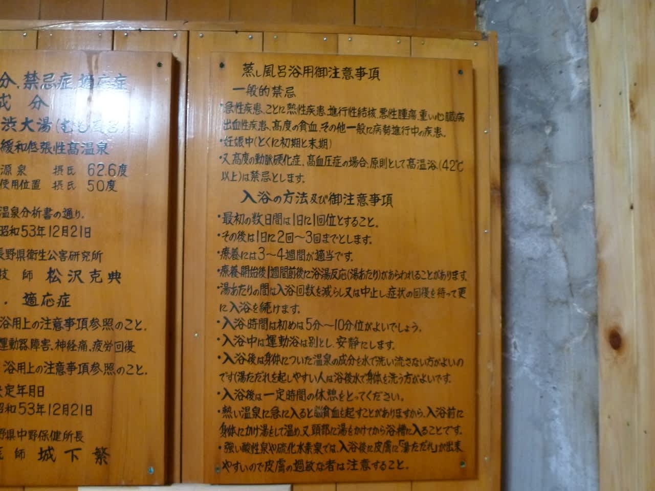 大湯にはこの浴槽の他、蒸し風呂なるものも併設されています。これは源泉の熱さを利用したミストサウナで、3人ぐらい入ったら窮屈になっちゃうほどの狭さですが、そこに満たされているのは源泉の蒸気そのものでして、サウナ室内は泉質由来の出汁みたいな匂いと木材のような香ばしい匂いが充満しており、入れば全身が源泉のミストで包まれるのです。霧状ですから呼吸によって源泉を吸引できますから、これによって体の表面のみならず内部まで癒されちゃうわけですね。単なるサウナと違って、なんだかとっても効能がありそう。でも湿度が高くて温度も高いので、結構苦しかった…。