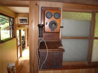 帳場で料金を支払い、渡り廊下を歩いて浴室へ。博物館に収蔵されていてもおかしくない、こんな古い電話が廊下に取り付けられています。受話器を耳に当てながら本体右側のハンドルをグルグル回して電話局の交換手を呼び出して、相手につないでもらっていたわけですね。