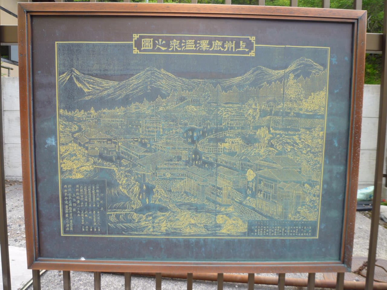 鹿沢温泉の由来の説明文や、大火以前の鹿沢温泉の様子を描いた当時の絵(復元)が掲示されていました。絵には何棟もの宿が描かれており、地蔵峠の道は非常に険しいにもかかわらず、かつては多くの浴客がこの温泉を訪れていたことが想像されます。