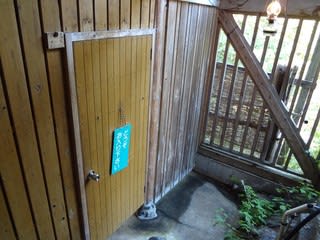 混浴の露天風呂へはここからスリッパに履き替えて、川岸へ下りてゆきます。館内には殺虫剤があちこちに置かれていますが、これも当地が自然豊かな環境である証拠ですね。