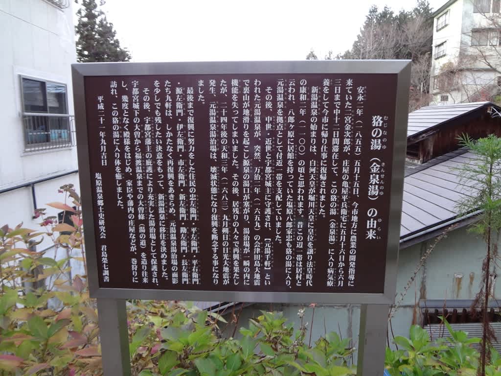 日塩もみじラインは新湯で幅員が広くなっているところがあり、その左手には共同浴場の一つ「寺の湯」が小さく佇んでいるわけですが、逆サイドに目を遣ると斜面を下る階段があり、その入口に「むじなの湯」と書かれた看板が立っているので、それに従い下ってゆきます。