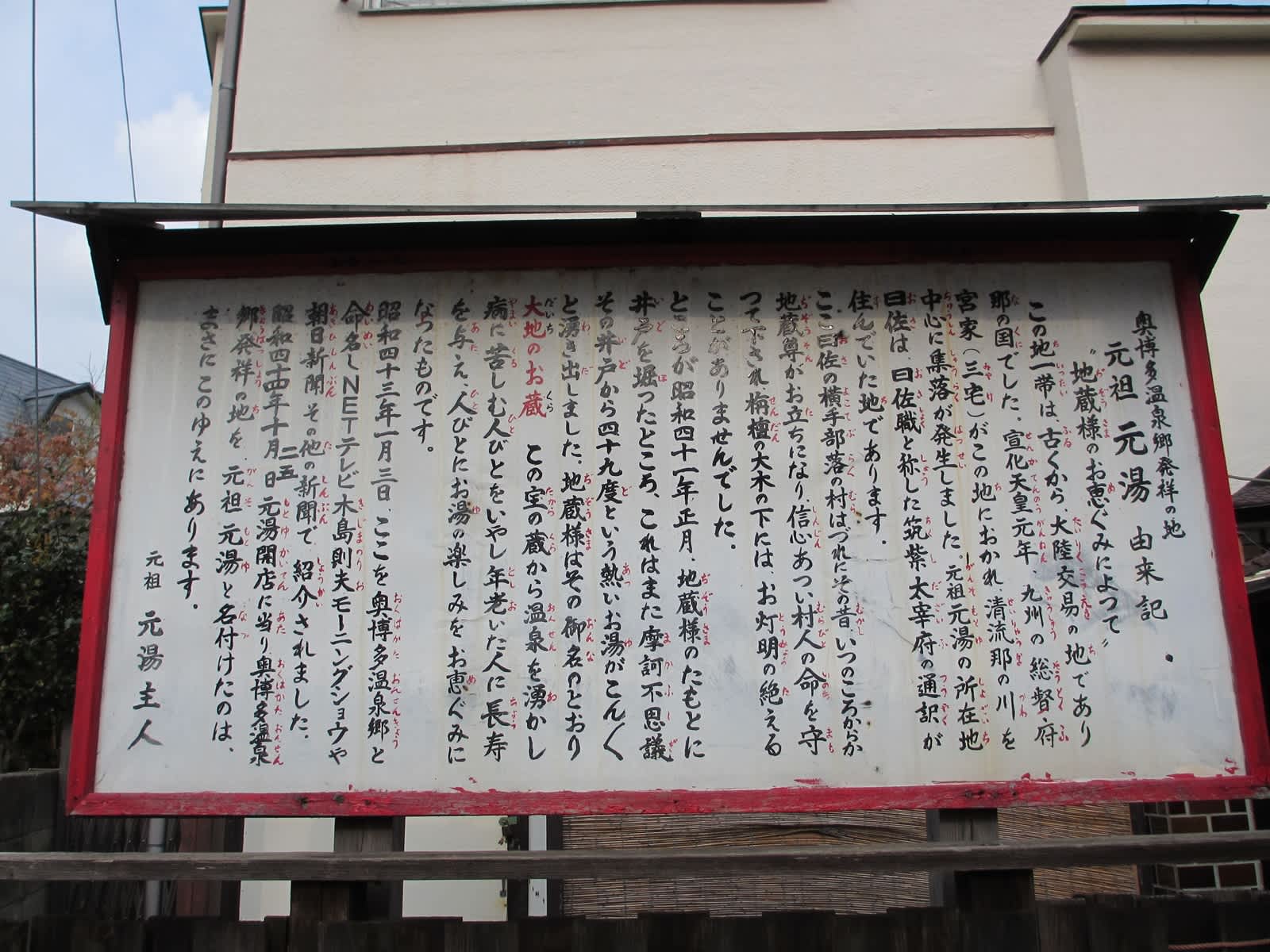 ごく普通の一般民家のような建物。本当にここで大丈夫なの? 勝手に入って良いの? 不安を抱きつつ、「追い返されたって仕方ねぇや」と杓文字を片手に民家へ突撃する桂米助のような心境で敷地へ踏み入ります。門から玄関へのアプローチの途中にはお地蔵さんが立っており、その上には温泉に関する説明の看板が立てられていました。ちょっと要約してみますと、昭和41年正月に地蔵様のたもとに井戸を掘ったら49度の暑いお湯が滾々と湧き出した、これは地蔵様が病苦の人を癒し老人に長寿を与え人々にお湯の楽しみをお恵みになったものだ、昭和43年にここを奥博多温泉郷と命名し、NETテレビ木島則夫モーニングショーや朝日新聞その他で紹介され、昭和44年10月25日元湯が開店となった…とのこと。NETテレビ(現在のテレ朝)や木島則夫モーニングショーという文言につい関心が向いちゃいますが、こちらは開湯してまだ50年も経っていない比較的新しい温泉なのですね。