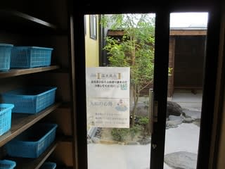 フローリングの廊下を進んで浴室の入口へ。お風呂は内湯と露天の両方を利用できるのですが、男女入れ替え制になっているのか、この日男湯は内湯と露天が別々になっており、双方の間を移動するには一旦廊下へ出ないといけない造りになっていました。受付で渡された館内着はこのためのものだったんですね。