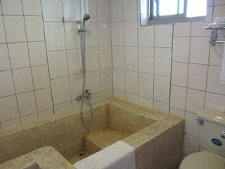 客室内のお風呂。バスタブのすぐ横に便器が設置されているので、せっかくのバスタイムも排泄という人間の摂理に向き合わなきゃいけないんのはちょっと残念なところ。浴槽自体は少人数向けの部屋にしては大きめの造りになっており(2人サイズ)、SPA的な雰囲気を醸し出したい意図なのか、お湯の水栓から湯舟に向かってスロープのような流路が設けられていました。