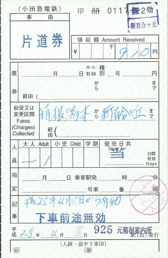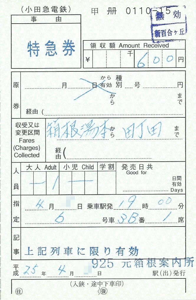 新宿以外は補充券で対応してくれます。左(上)は箱根湯本→新百合ヶ丘の乗車券、右(下)は箱根湯本or小田原→町田までの特急券です。特急券は列車名が無かったり席番の記載場所を誤解していたりと、記入方法に関して突っ込みどころ満載ですが、ま、支障なく乗れたので問題なし。