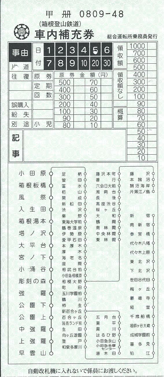 こちらは箱根登山線の車内補充券です。小涌谷を含め、宮ノ下や大平台などの駅は日中以外無人となり、切符を購入することもできませんので、車内で車掌さんから購入することになります。数年前まではどの路線でも車内で精算するなんて極めて当たり前でしたが、首都圏の大手私鉄ではほとんど車内精算が消えてしまい、一部の中小私鉄に残るばかりですね。箱根登山電車ではSuicaやPASMOでも乗車できますから、車内精算するお客さんも減っているかもしれませんね。