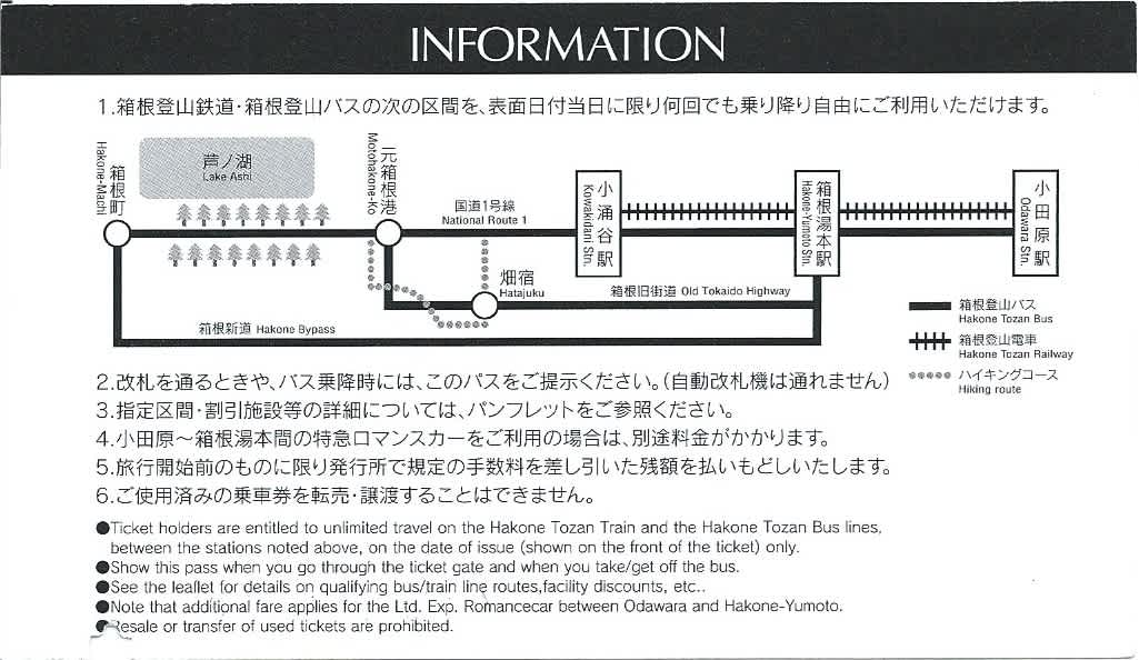 首都圏屈指の観光地である箱根には様々なフリーパス類が発売されていますが、「箱根旧街道・1号線きっぷ」もその一つでして、箱根登山鉄道の駅や箱根登山バスの案内所、小田急の各駅で購入できる一日限り有効のものです。名称の通りに奥湯本や畑宿などの旧街道沿いや、宮ノ下・小涌園・芦之湯・元箱根・箱根町など国道1号線沿いを散策するにはとっても便利であり、小田原から芦の湯以遠(元箱根や箱根町など)を単純往復するだけでも、正規料金よりこの切符を買ったほうがかなり安く済みます(箱根は路線バスの料金設定が妙に高いんです)。しかしながら他のフリーパス類と同様に小田急グループ(箱根登山)と西武グループ(伊豆箱根)で利用できる交通機関が分かれており、発売箇所からもわかるようにこの切符は小田急グループのみの適用となりますので、同じルートを走っている伊豆箱根バスには乗車できません。また強羅・仙石原・大涌谷方面も使えません。