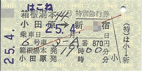 左(上)は箱根湯本→新宿の乗車券、右(下)は箱根湯本or小田原→新宿までの特急券です。いずれもA型硬券です。小田急の硬券特急券は、上り列車については券面に赤い斜線を引くのが伝統となっていますが、この券もちゃんとその伝統に則っていますね。なお特急券の発券に際しては、まず窓口の方が客から希望列車・乗車区間・人数を聞き出して所定の台紙に記載し、電話でどこかへ問い合わせ、座席が確保できたら券に必要事項を記載します。