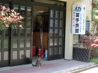 前回取り上げた「藤助屋」さんから歩いて数十秒のご近所にある「冨手旅館」が次なる訪問先です。こちらのお風呂は「鶴の湯」と称されているようです。玄関ではニャンコがお出迎え。