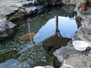最もダムに近い上流側にあるのが「子宝の湯」。ここは「長寿の湯」より透明度では劣るものの、砂利敷きの底よりプクプクと上がる気泡とともにお湯が供給されており、42~3℃という最適な湯加減だったので、一人で訪れているお風呂が好きそうな男性客を中心に、最も人気を集めていました。男が「子宝の湯」に入ったってその恩恵は受けられるはずありませんけどね。