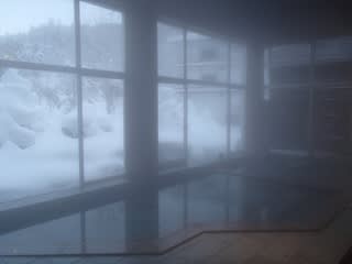 脱衣室からステップを数段下りて浴室へ。雪景色の池に面して天地いっぱいに大きな窓ガラスが用いられており、室内空間なのに閉塞感は無く、明るくゆとりのある環境が生み出されています。また床には十和田石が敷かれており、素足で歩いた際に伝わってくる十和田石ならではの気持ち良い感触も、居心地の良さに一役買っています。なお内湯のみで露天風呂はありません。