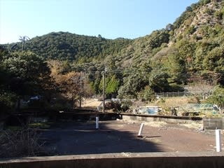 橋を渡った先には養魚場跡と思しき施設の廃墟が寂しい姿を晒しているのですが、その奥へ進んでゆくと、左手に駐車場のような空き地が広がりはじめます。
