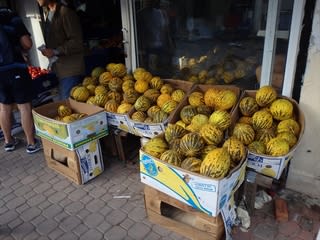 長期滞在者はここで自炊するのだろう。土産屋や宿泊施設などと並んで、八百屋など食料品店も見かける。秋でも温暖な気候なのだろう、店頭にはスイカがたくさん積まれていた。黄色いスイカは日本では見かけない。