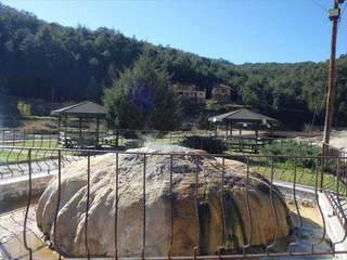 公園には対岸に架かる人道橋が2本あり、上流側の橋には施設名を記していると思しきゲートが立てられていました。おそらく対岸にはかつてそのゲートが示す何らかの建物があったと想像されますが、今ではすっかり解体されており、砂利と泥の荒れ地が広がるばかりです。この上流側の橋のたもとでも、当地に余多ある源泉のひとつを発見。湧出地は石で丸く囲まれています。