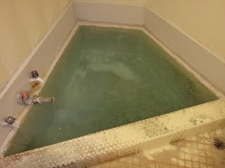 小さな浴室にも入ってみました。室内空間も浴槽の容量も大きな浴室より一回り小さく、しかも浴槽は台形の右上を潰したような変則的な形をしています。槽には青く小さな円形タイルが貼られているのですが、その大部分はイオウの付着によって白や黄色に染まっていました。