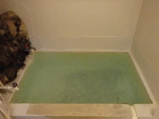槽自体の色に影響されるのか、湯船のお湯は薄い黄色(見方によっては緑系)を帯びているように見えるものの、入浴前の浴槽は底がはっきり確認できるほど、高い透明度が保たれていました。しかし実は底には湯の華が沢山沈殿しており、私が湯船に入ると湯華が舞い上がって、一気に白濁しました。左(上)側の画像は入浴前、右(下)画像は入浴後の、浴槽の様子です。小さい画像だと分かりにくいかもしれませんが、前と後では濁り方がはっきりと異なっており、入浴中は白濁をもたらす無数の白く細かい湯華に包まれました。