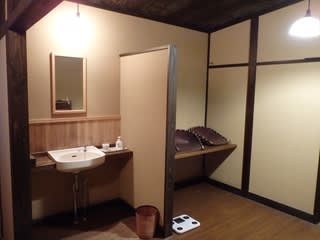 民芸調の内装が施された脱衣室は広くて快適。洗面台も設置されており、使い勝手も良好です。内線電話も引かれていますので、万が一の時も安心ですね。棚の上には、籠の代わりに箕が用意されていました。