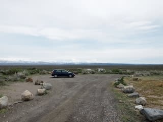 5月中旬のヨセミテ東部は、うっすら雪化粧するほど冷え込んでいました。同じカリフォルニア州のロサンゼルスは夏のような暑さでしたから、山を隔てるだけで気候が全く違うのですね。雪をかぶったヨセミテの山々を仰ぎながら、”Benton Crossing Road”より分かれた広いダート路を進み、更に途中で右折してしばらく進むと、やがて道は行き止まりになりました。広くなっているスペースに車を止め、入浴グッズを持参して露天風呂を探します。