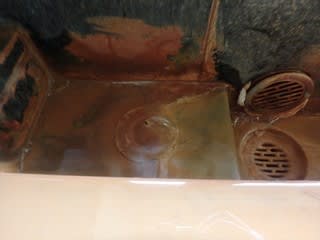 お隣の浴室と隔てる塀には、析出がコテコテにこびりついている湯口が取り付けられており、そこから滔々とお湯が注がれていました。浴槽に張られたお湯は窓側の溝へオーバーフローしています。浴槽のヘリはうろこ状の析出がこびりつき、赤黒く染まっていました。なおその溝には下からピューピューと細い筋を描きながらお湯が噴き上がっている箇所がありました。浴槽上部からの溢れ出しのほか、オーバーフロー管のようなものも設けられているのかもしれません。