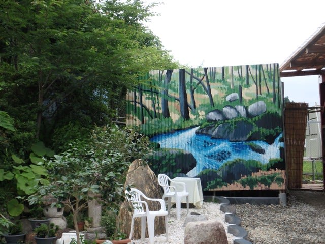 露天から外を眺めますと、すぐ目の前には、波板にペンキで描いた風景画が立てられていました。上述したように塩谷エリアでは名水「尚仁沢湧水」に因んだ「たかはら山麓水街道」と称する観光キャンペーンを打ち出していますので、この絵は「尚仁沢湧水」を描いたものなのかもしれません(あくまで私の勝手な推測です)。