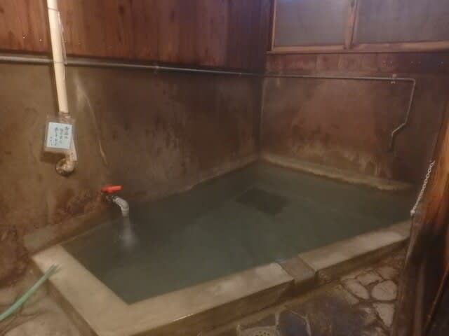 湯口から湯畑源泉のお湯が投入されており、バルブが付いているので投入量を調整することができます。また水道のホースで加水することも可能です。私が訪問した時は、前に入ったお客さんが加水しすぎたらしく、妙にぬるかったので、水を止め、バルブを開けて、ちょっと熱めの湯加減にしてから肩まで湯に浸かりました。2人サイズの浴槽とはいえ、男の図体では少々狭いように思われます。一方、一人で入るならばゆったりできる貸切風呂サイズ。