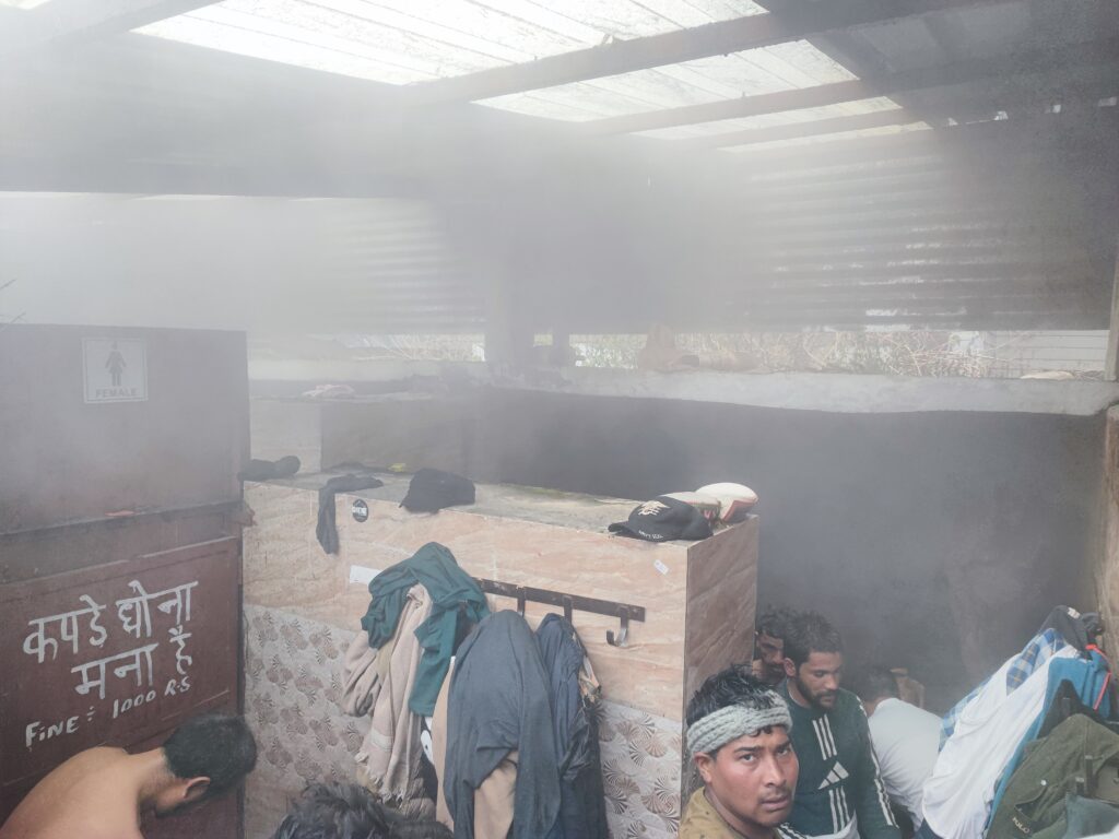 掘っ立て小屋の内側はこのように露天の公衆浴場となっており、訪問時は地元のおじさんでとても賑わっていました。決して空いているとは言えませんが、でもこの利用状況なら問題なく入れそうでしたので、上画像の左側にある受付小屋で入浴料の25ルピーを支払って入場し、トタンの壁にずらりと並ぶフックに荷物や衣服を引っかけながら水着に着替え、他のお客さんに倣って浴槽のオーバーフローが出る洗い場で体を洗ってから湯船に入りました。