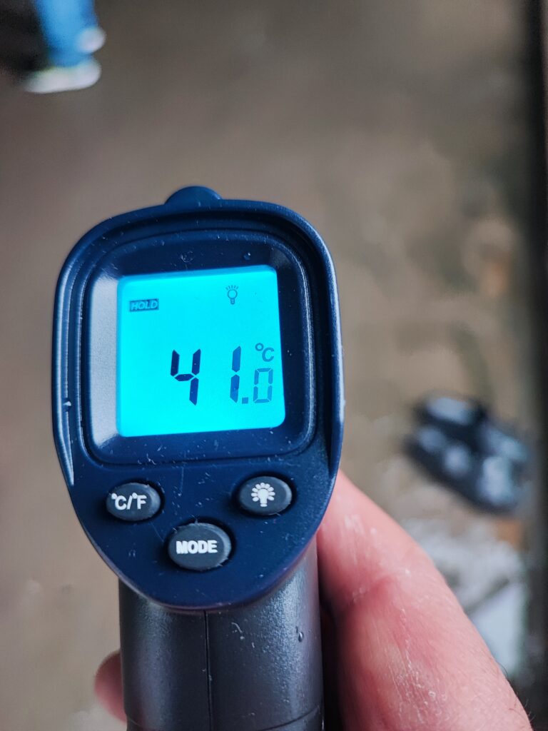 小屋の前に広がる河原には温かい温泉のお湯が流れています。上画像で赤っぽくなっている河床が温泉の流路です。