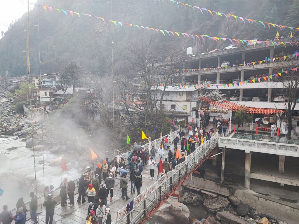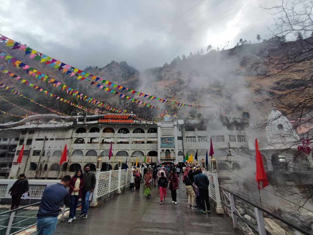 橋の上では湯煙が上がる中で観光客が記念撮影しています。ターバンを巻いていない男性はおそらくシク教徒ではない物見遊山の人かと思われます。