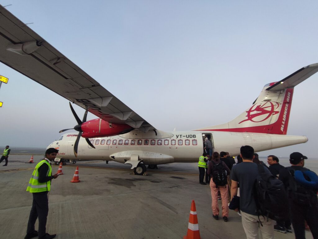 デリー6:45発クル行きの飛行機は、小さなターボプロップ機のATR42-600。プロペラが剥き出しなので昔ながらのレシプロ機だと誤解されますが、一般的なターボファンエンジン機と同じく、ジェット機にカテゴライズされる飛行機です。日本でも同型機は離島便や地方都市間を結ぶ路線で就航していますので、旅慣れた方でしたらお馴染みの機体と言えそうです。