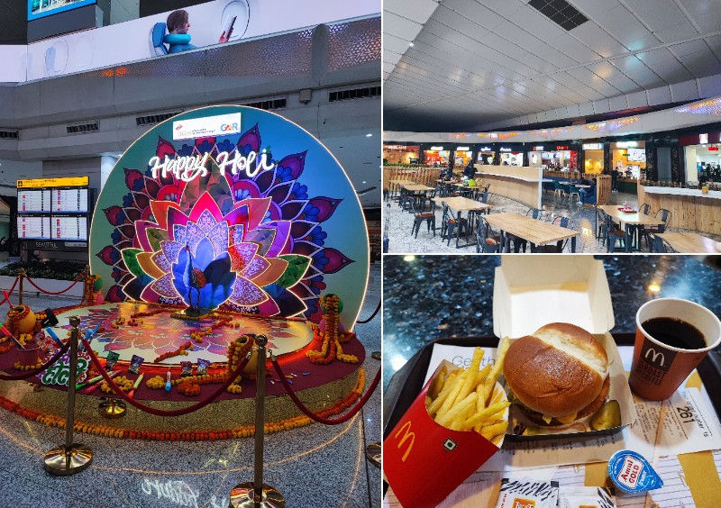 この日はちょうどホーリー祭りの期間でしたので、ターミナル内にも祭りを祝う装飾兼撮影スポットが設置されていました。そんな飾りを横目に、お腹が空いていた私はフードコートへ。しかし早朝から空いている店舗は少なく、前日までインド料理を食べ続けてスパイシーな味に飽きていたので、無難なマクドナルドで無難なメニューを注文しました。普段はファストフードを利用しない私も、この時ばかりは無難な味覚に救いを求めたのです。無難・・・なんて良い響きなんでしょう。