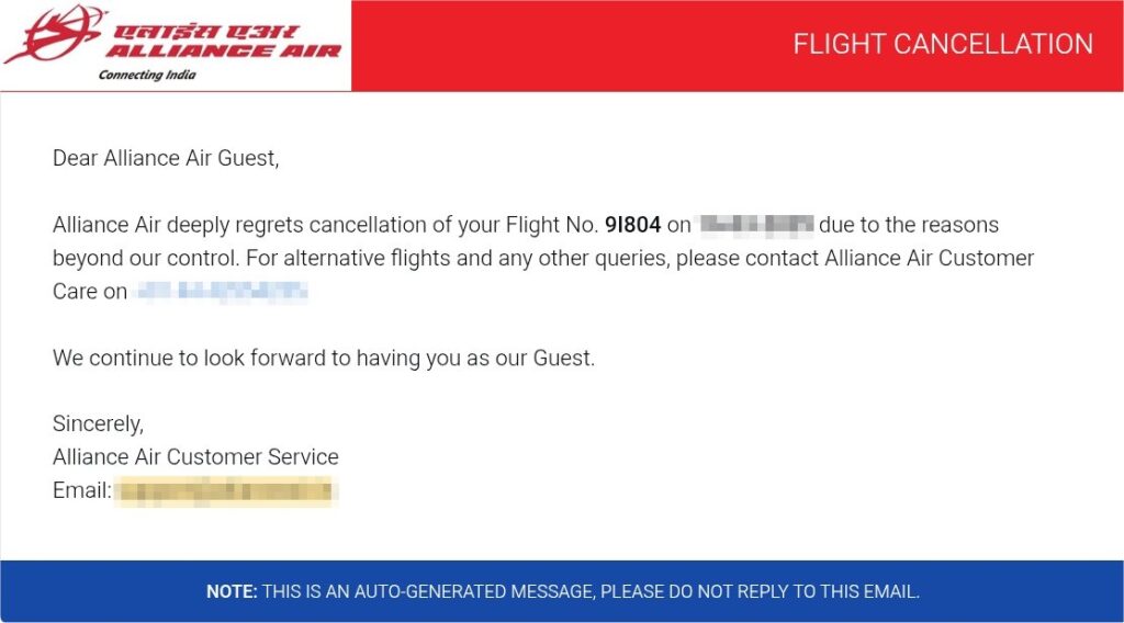 Alliance Air deeply regrets cancellation of your Flight No. 9I804 on (搭乗年月日) due to the reasons beyond our control. For alternative flights and any other queries, please contact Alliance Air Customer Care on (カスタマーサポートの電話番号).