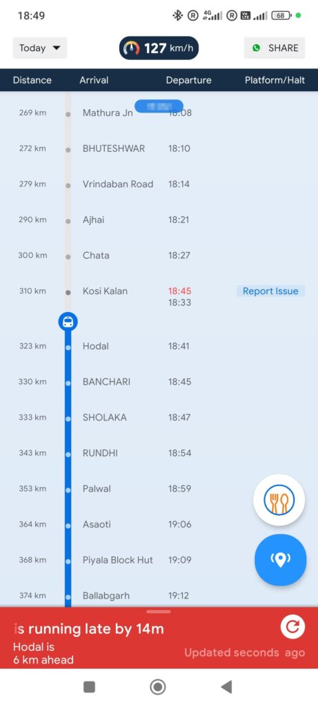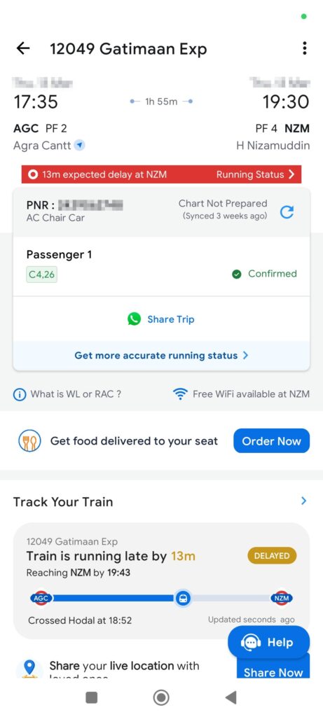 インドの鉄道でとても便利だったのが公式アプリ”ixigo”でした。当然無料でダウンロードでき、インド鉄道のアカウントを持っている人はアプリから予約もできるそうですが、アカウントの作成に失敗した私でも、たとえば予めアプリにチケットのPNR(予約番号)を入力しておけば、自分の予約に関する様々な情報が表示されます。たとえば・・・