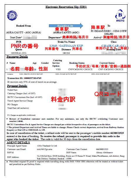 これが送られてきた電子発券のバウチャーです。どうやらインド鉄道でオンライン予約した際に発行される正式なバウチャーの様式のようです。