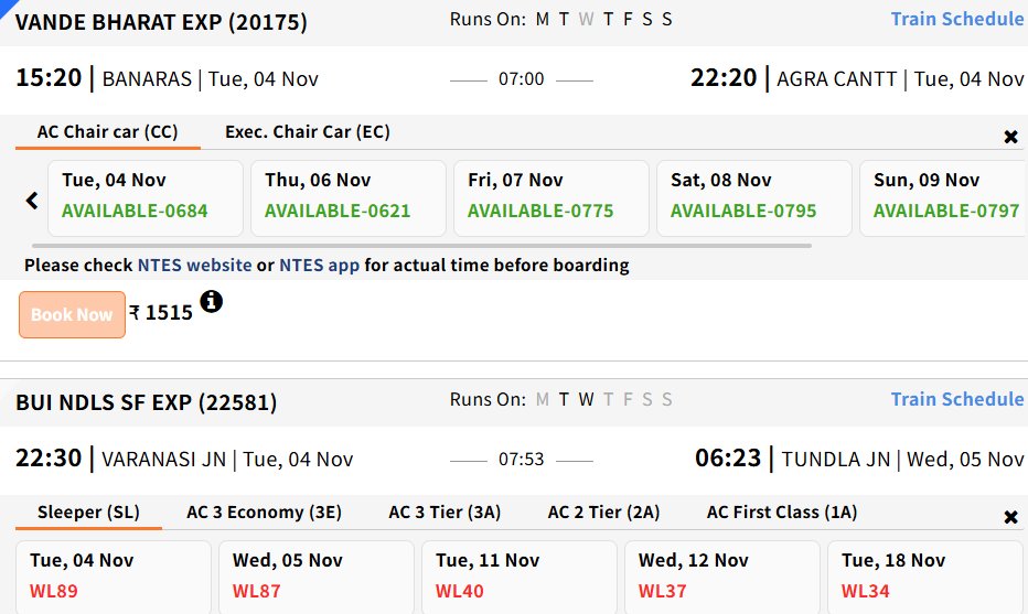 こんな感じで検索結果が表示されます。例として11月4日のバラナシからアグラへ向かう全列車を検索し、その中から2列車分のスクリーンショットを貼り付けました。列車名(列車番号)、出発及び到着の駅名と時刻(所要時間)、運転される曜日、連結される車両の種類や等級、検索日とその先4日分の車両の種類や等級別残席数、料金が表示されます。調べたいクラス(等級)をクリックすれば、そのクラスの残席数に表示が変わります。赤字で「WL」と表示されているのは”waiting list”つまり空席待ちの数であり、言い方を変えれば現在満席ということです。インドでは空席待ちの状態で予約を申し込むことができるらしいので、その点については詳しいサイトをご覧ください。