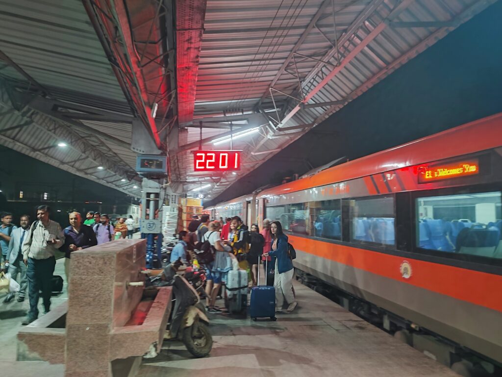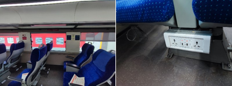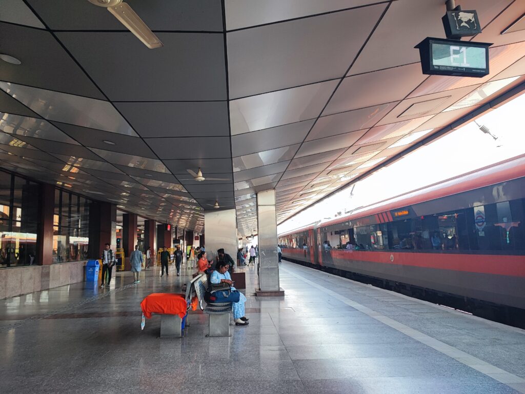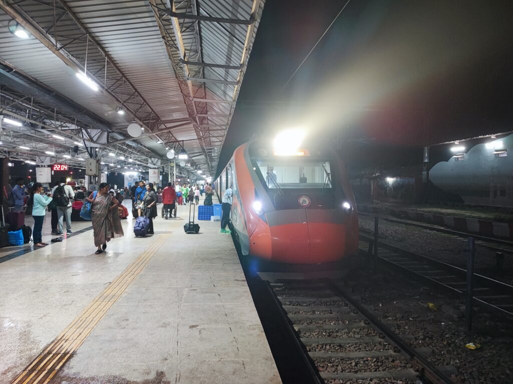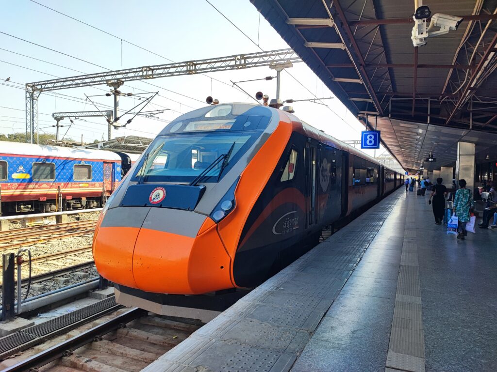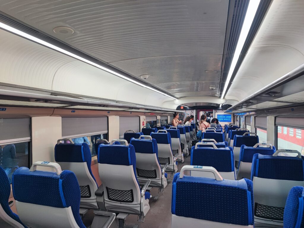 これが今回乗車した”Vande Bharat Express”(ヴァンデ・バーラト・エクスプレス)です。ネットでこの車両を調べると、東海道新幹線の義理の親戚みたいな塗装、即ち白地に青いラインが引かれている電車の画像が表示されますが、どうやら2023年以降に登場した車両は塗分けが全面的に変更され、上画像の暖色系塗装になったそうです。つまりこれから乗る車両は運用開始から2年程度しか経っていない新車に近い状態と言えそうですね。