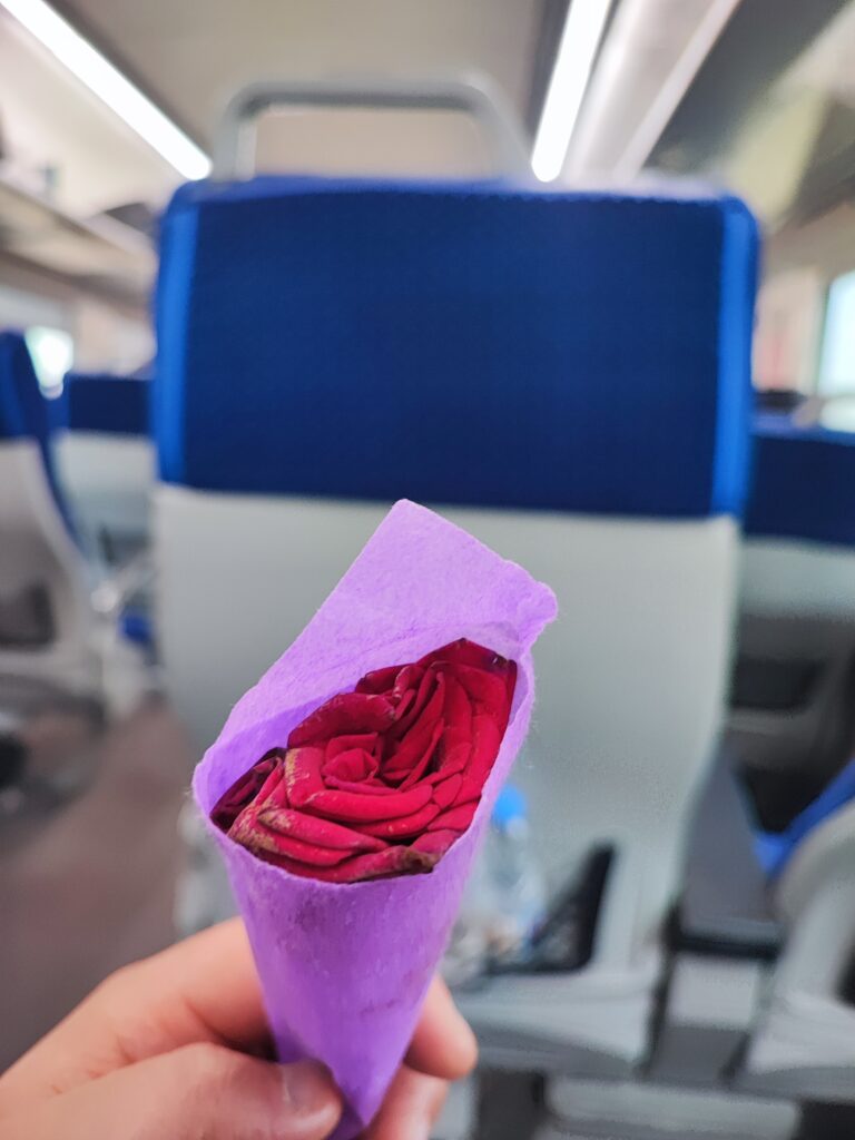 ほぼ定刻(15:20)に発車。出発してまもなくすると、乗客一人一人に一輪のバラが配られました。インドで1等車に乗るとこれが当たり前なのかしら。