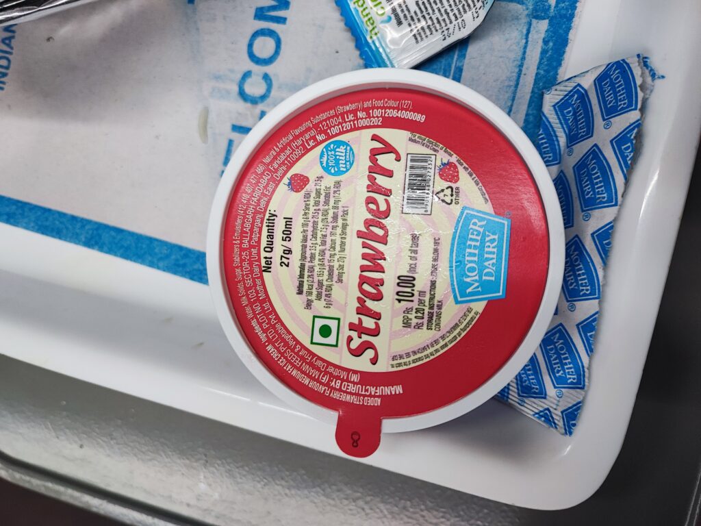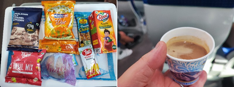 “Vande Bharat Express”は食堂車が無い代わり、車内サービスが充実しています。バラが配り終わったら、今度はおやつの配布が開始されました。おやつとはいえ、その量が尋常ではなく、キャラメルポップコーン、麦のポン菓子、ヌガー、ナッツとドライフルーツのミックス、油っぽいパンのような物(トマトケチャップ付き)といった内容で、これにお湯で溶かす粉末のチャイ(お湯はスタッフが注いでくれる)も加わり、とても一人では食べきれません。半分近くは持ち帰りました。